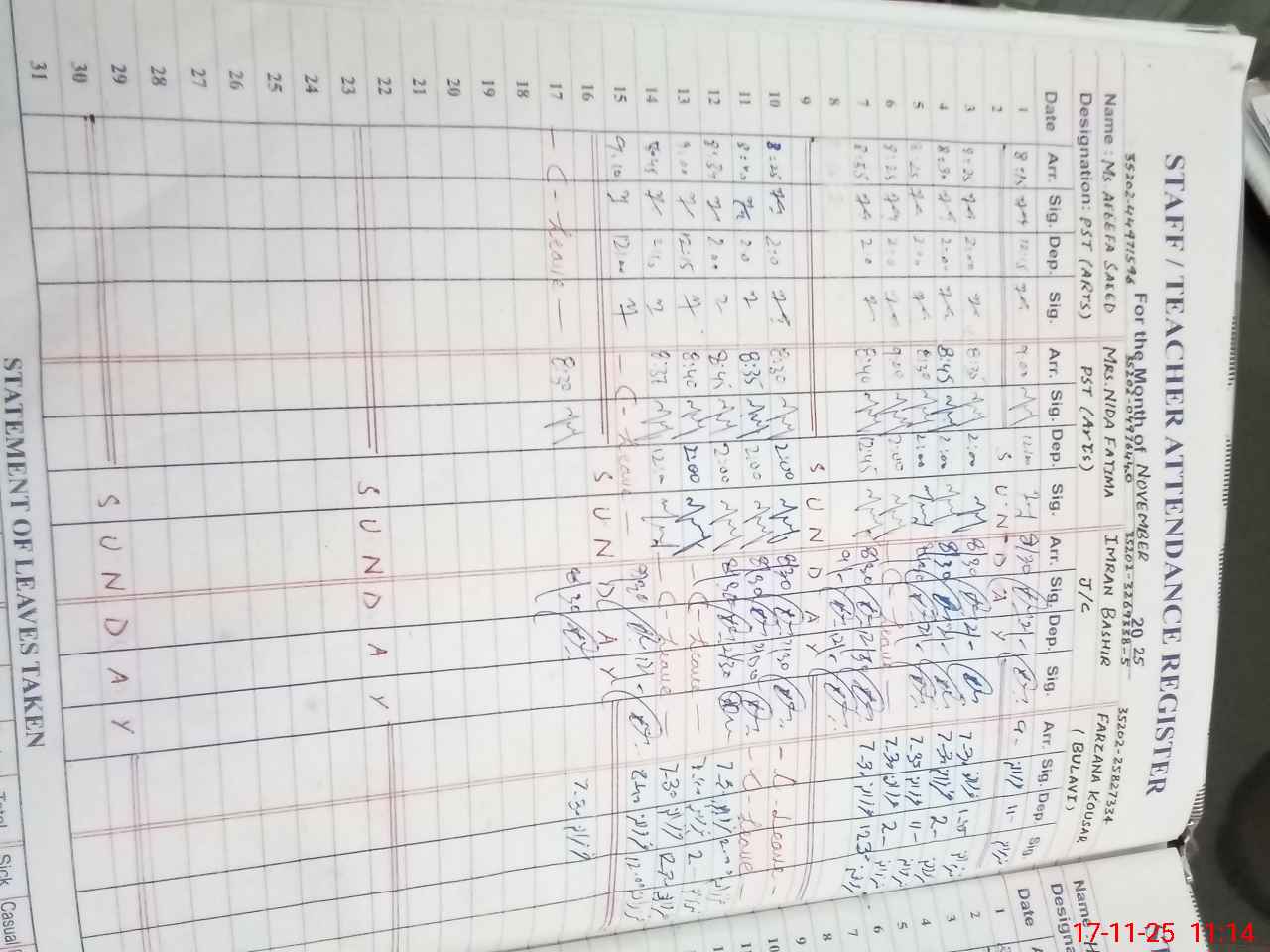 | CNIC | Full Name | Designation | R/C | Absence During Last Calender Month |