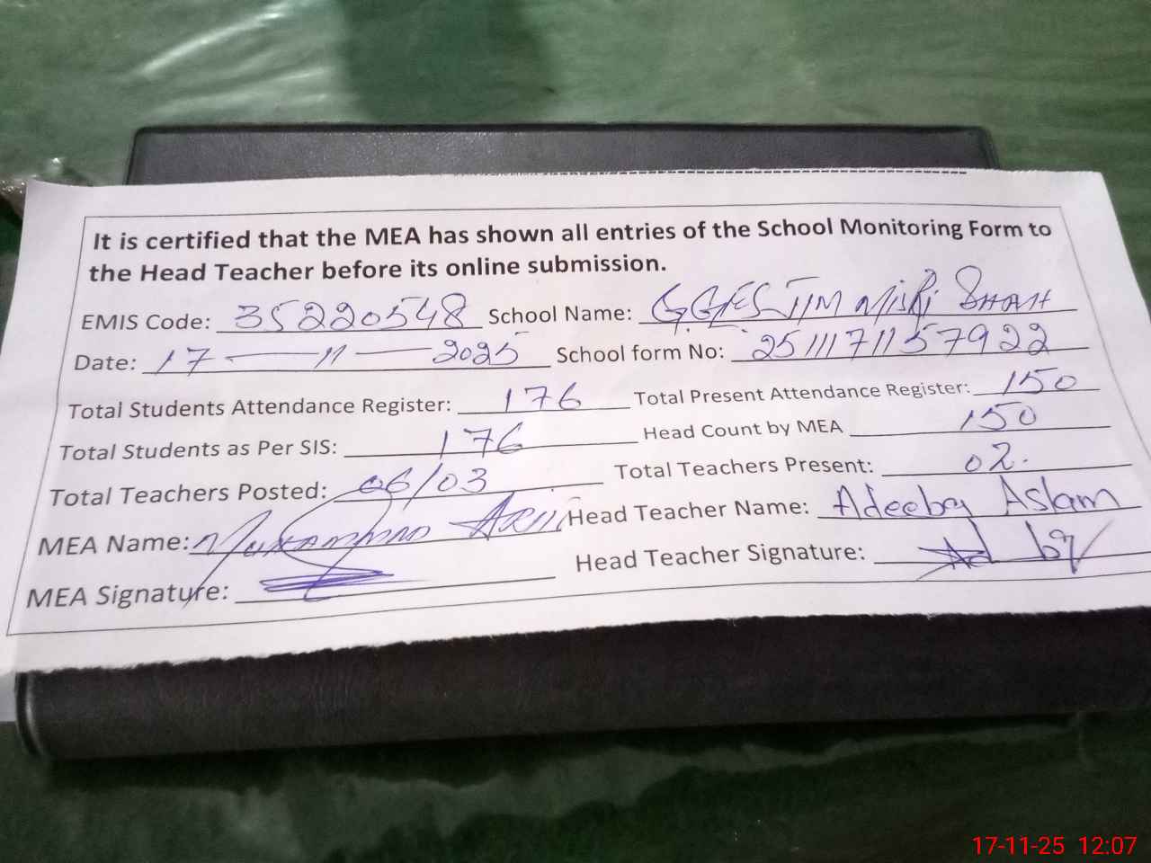 | Attendance Register | Head Teacher | MEA with School | Visit Proof |