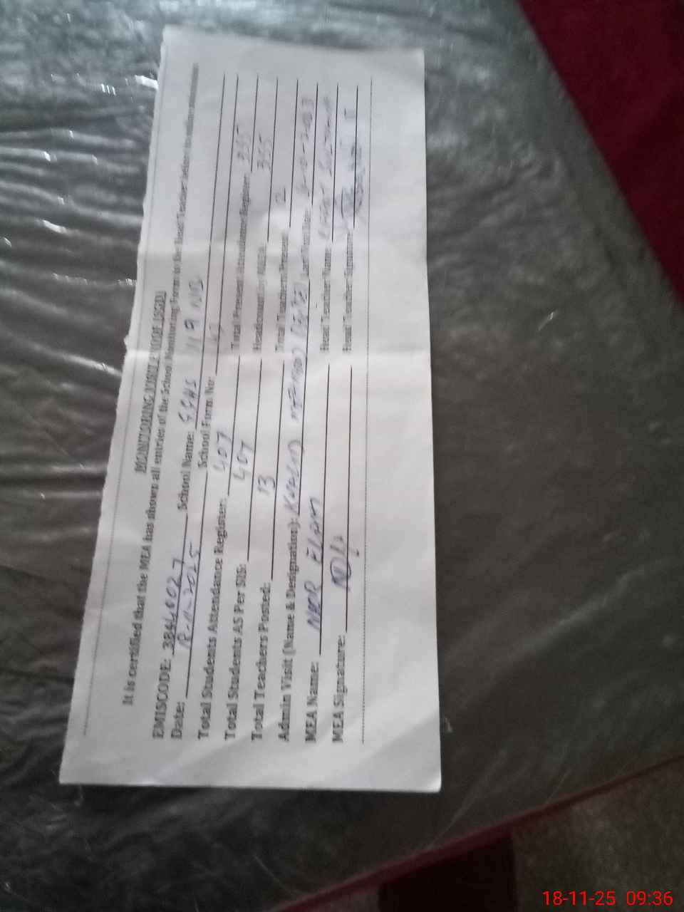 | Monitoring Date: 18-11-2025 | Start Time: 18-11-2025 09:20 AM | End Time: 18-11-2025 09:47 AM | Name of MEA: NO**** EL**** | |