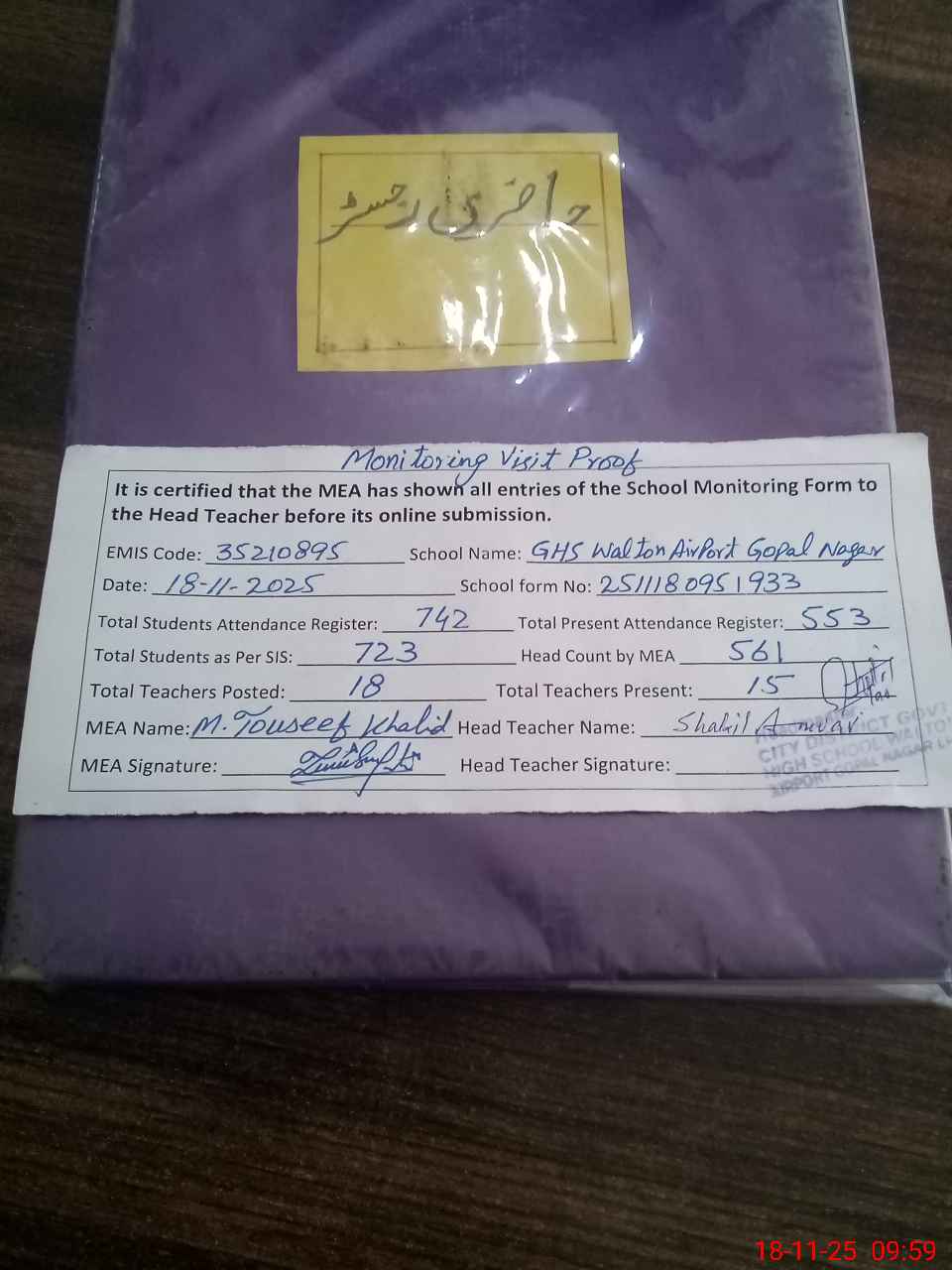 | Remarks (Use Separate Page if Required): Total sanctioned seats Teachers 21 Filled seats Teachers 18 DEO SE LHR Visit date 15 September 2025 Special observation Rizwan josaf water man on temporary duty since long time about 6 years till to date He is performing duty School education department and attached with office of secretary | |||||