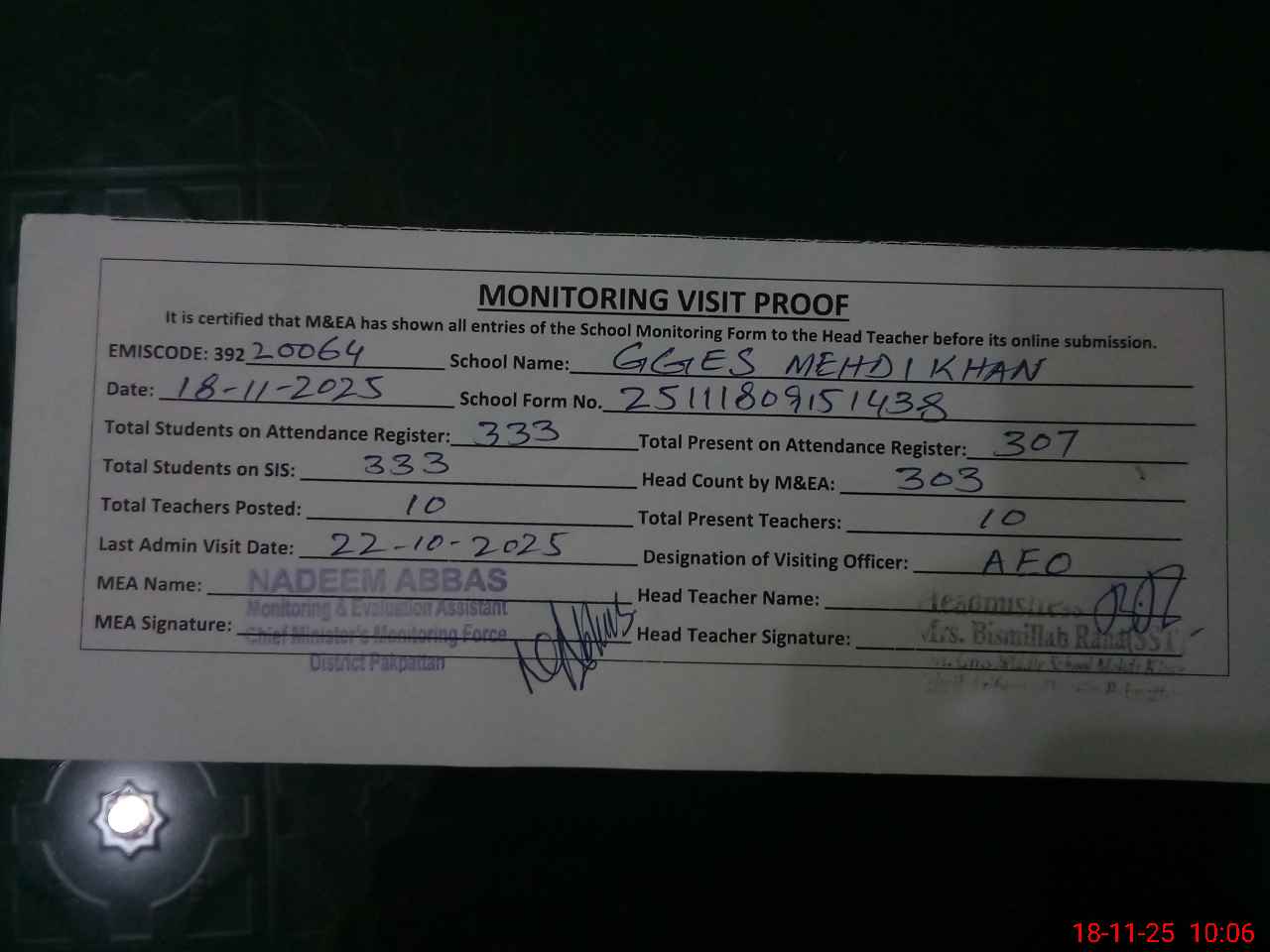 | Certified that this School was Inspected by the Undersigned MEA/DMO Today and the Information Stated Above is as Per Record. | |||||