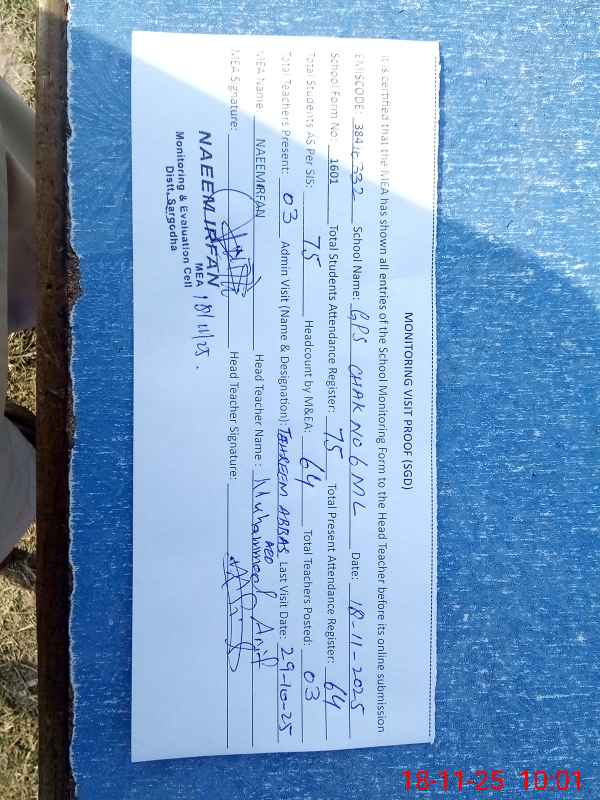 | EMIS Code: 38410332 | Name of School: GPS CHAK NO.6 ML | |||