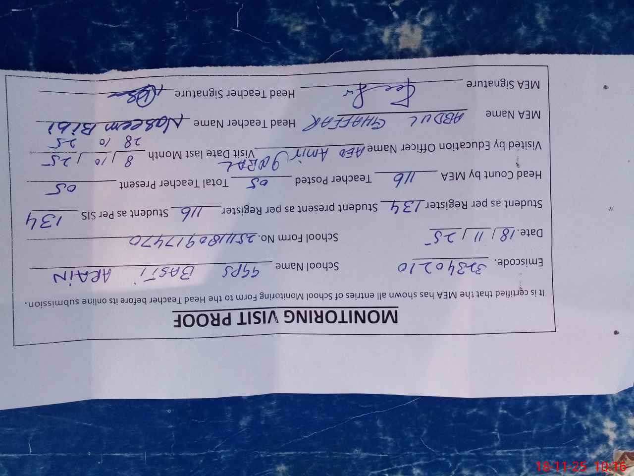 | Attendance Register | Head Teacher | MEA with School | Visit Proof |