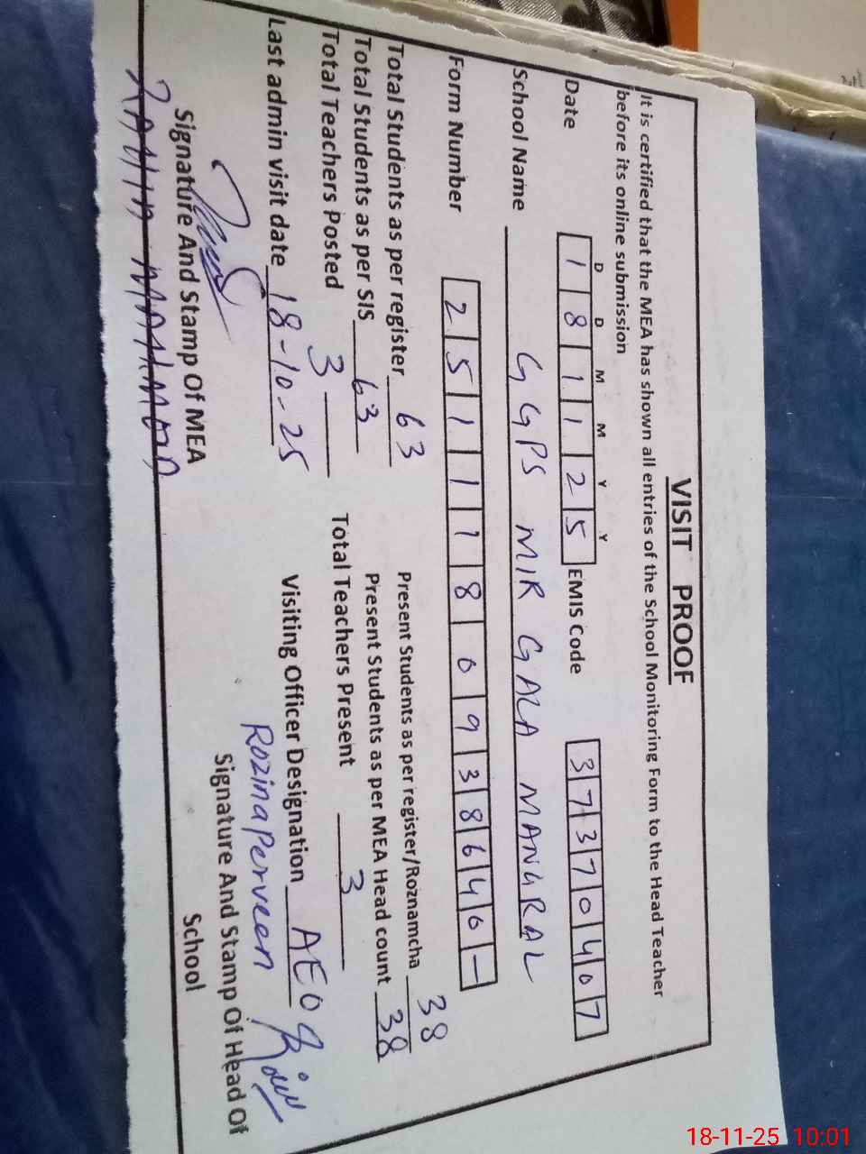 | Monitoring Date: 18-11-2025 | Start Time: 18-11-2025 09:35 AM | End Time: 18-11-2025 10:04 AM | Name of MEA: Za**** Me**** | |