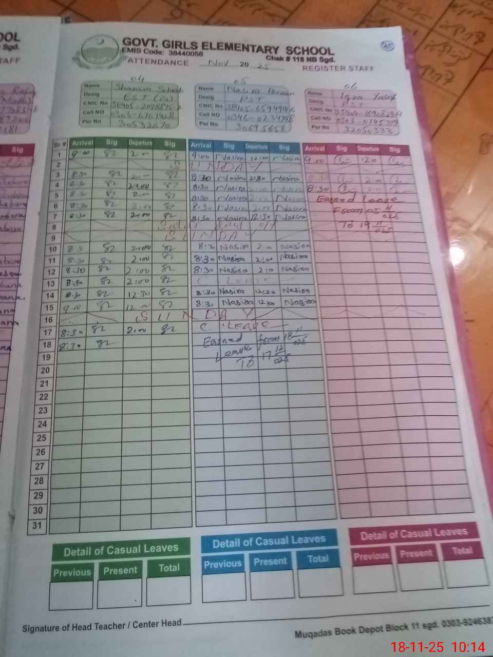 | CNIC | Full Name | Designation | R/C | Absence During Last Calender Month |