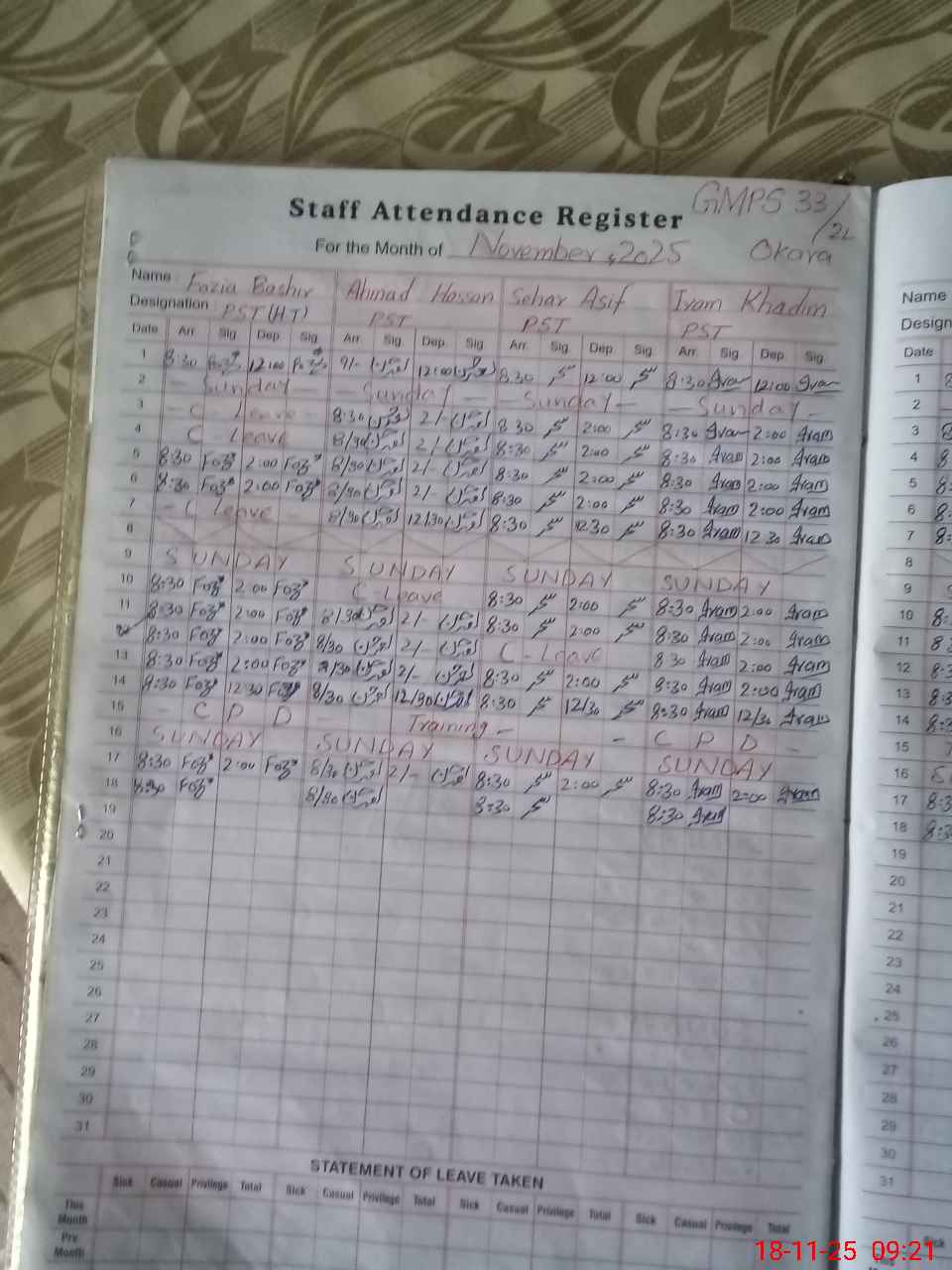 | Leave | Duty | Absent | Maternity | Medical | Ex- Pak |