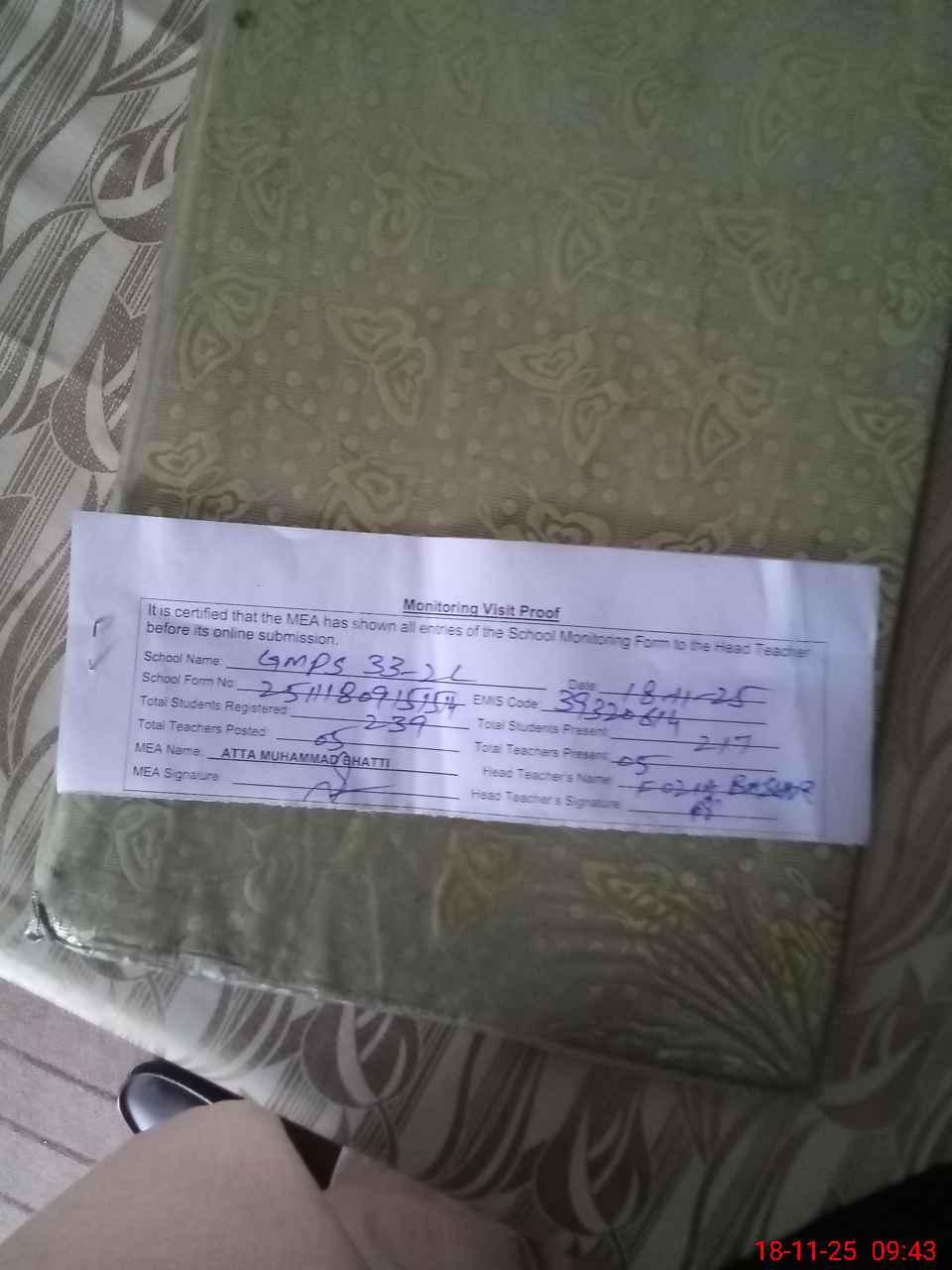 | Remarks (Use Separate Page if Required): Last admin visit by AEO on 12 November 2025 NSB record not available at time of visit Boundary wall of boys portion about 1240 RFT required to build | |||||