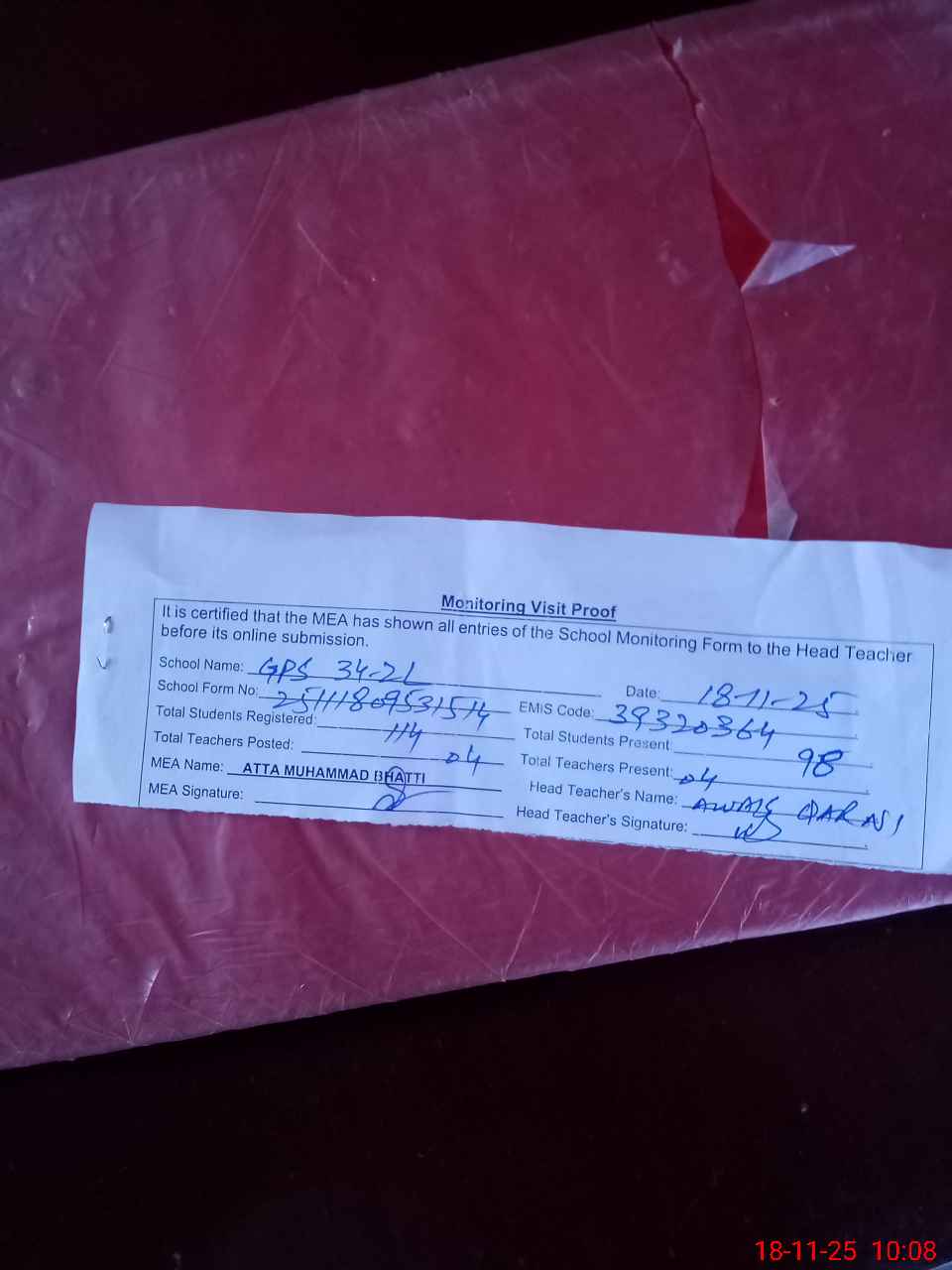 | Attendance Register | Head Teacher | MEA with School | Visit Proof |