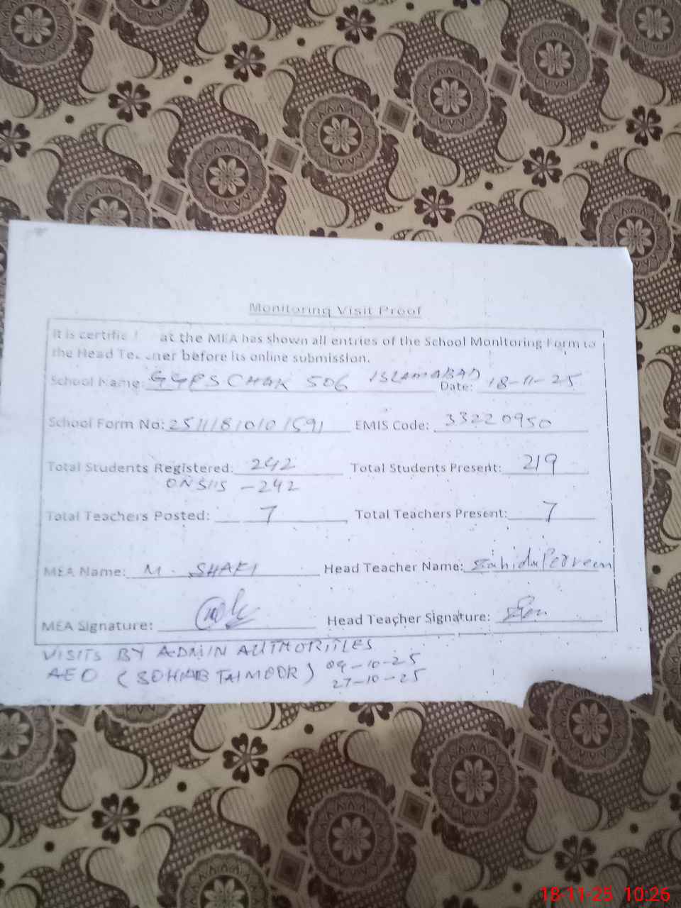 | EMIS Code: 33220950 | Name of School: GGPS CHAK 506 ISLAMABAD | |||