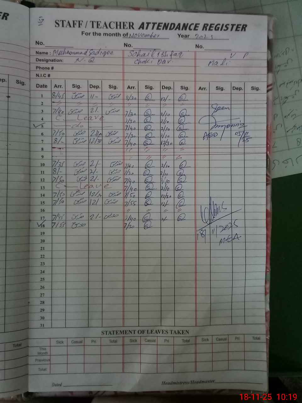 | CNIC | Full Name | Designation | R/C | Absence during last cal. month |