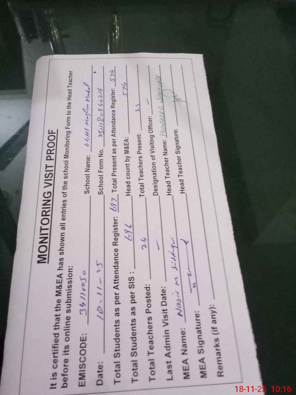 | Attendance Register | Head Teacher | MEA with School | Visit Proof |