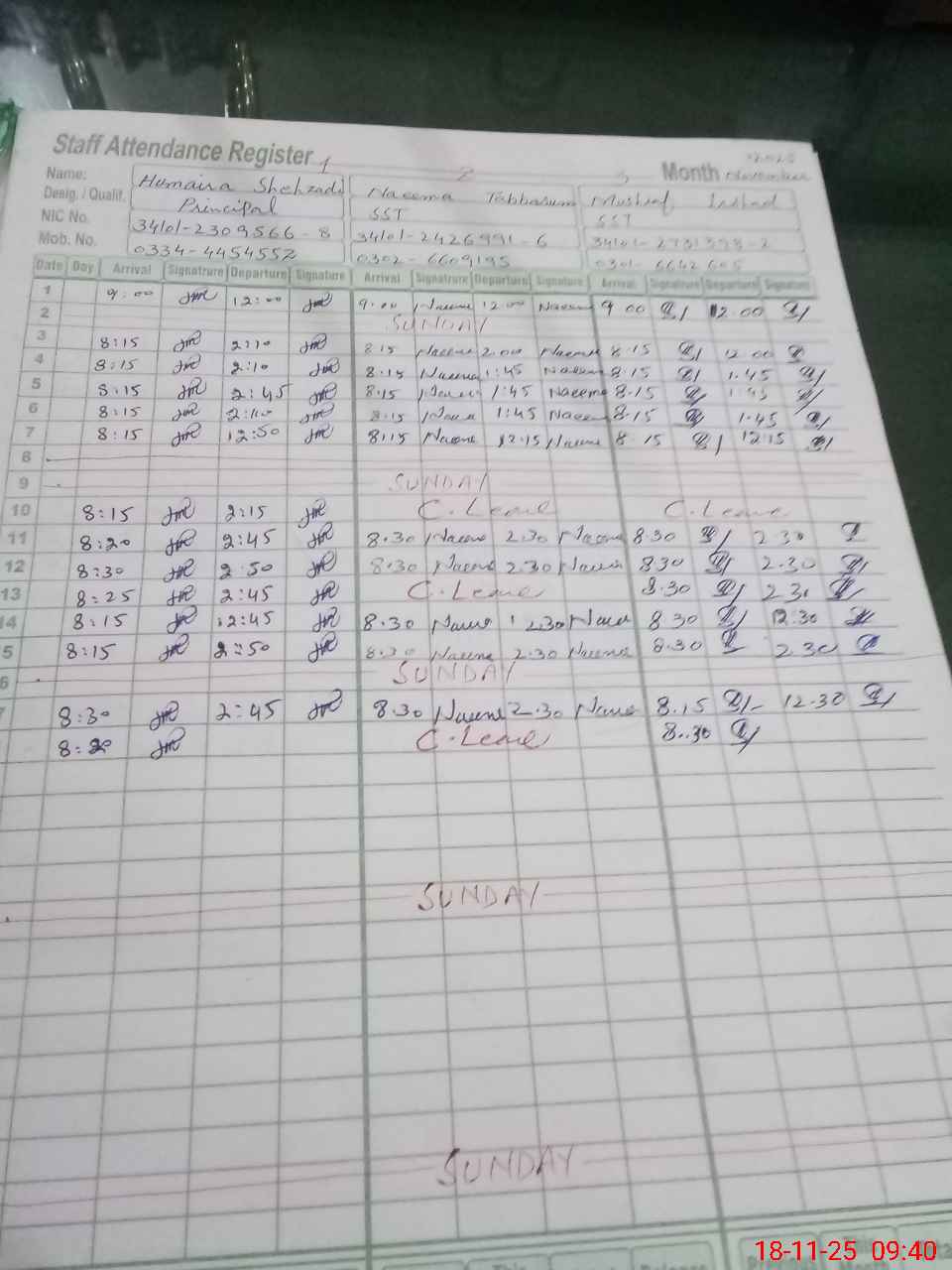 | CNIC | Full Name | Designation | R/C | Absence during last cal. month |