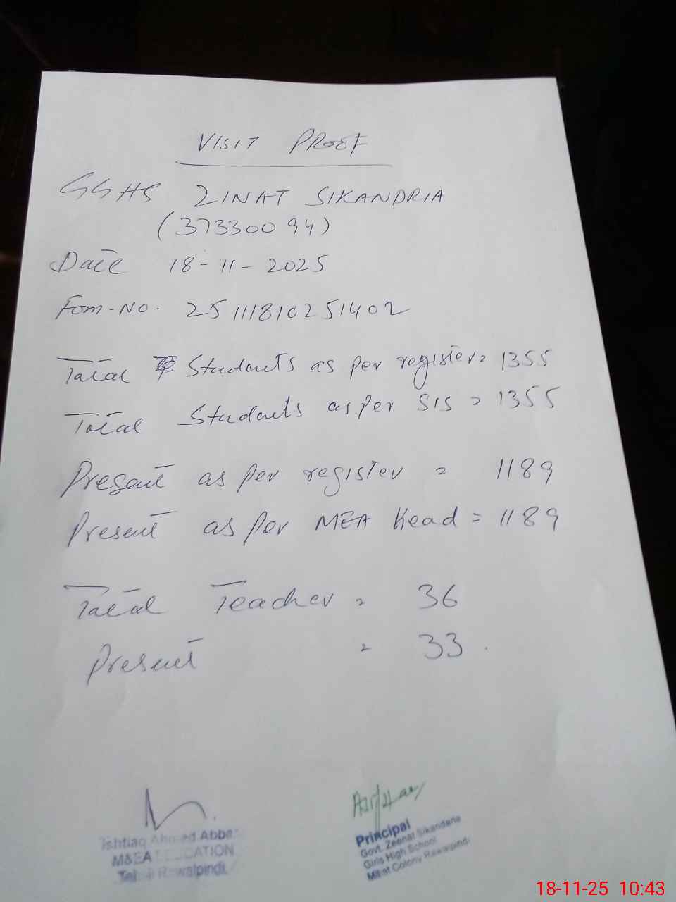 | Attendance Register | Head Teacher | MEA with School | Visit Proof |