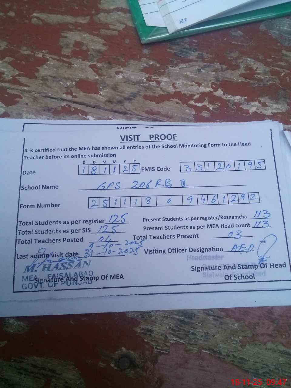 | EMIS Code: 33120195 | Name of School: GPS CHAK 206 RB II | |||
