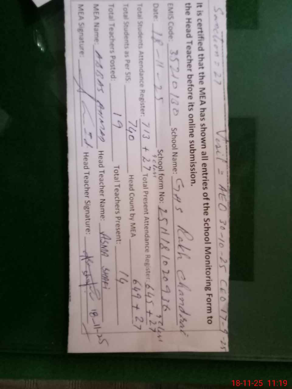 | Attendance Register | Head Teacher | MEA with School | Visit Proof |