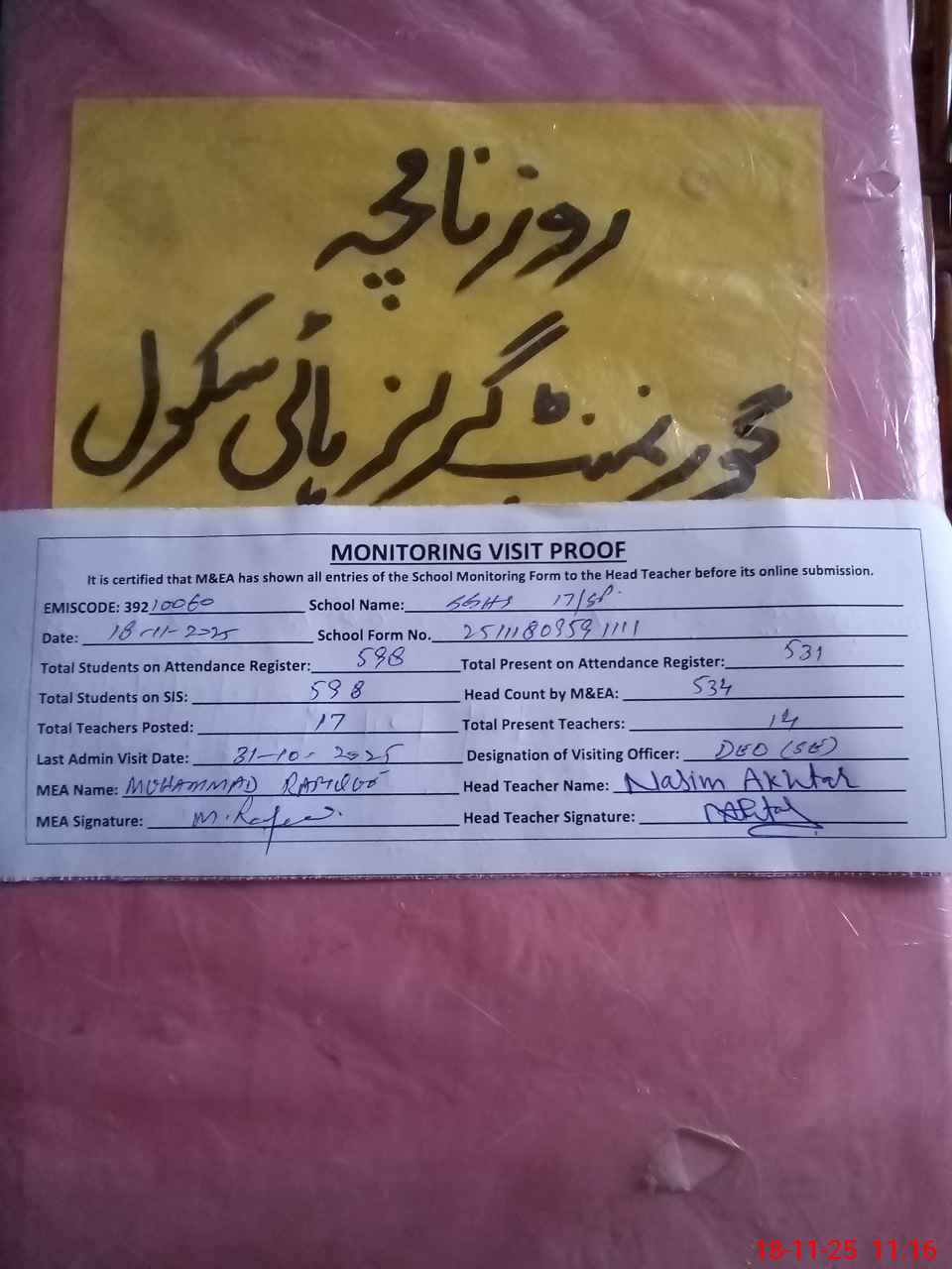 | EMIS Code: 39210060 | Name of School: GGHS 17/SP PAKPATTAN | |||
