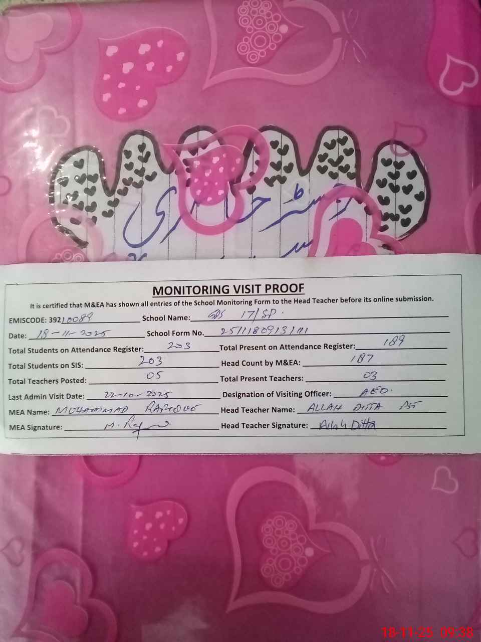 | Attendance Register | Head Teacher | MEA with School | Visit Proof |
