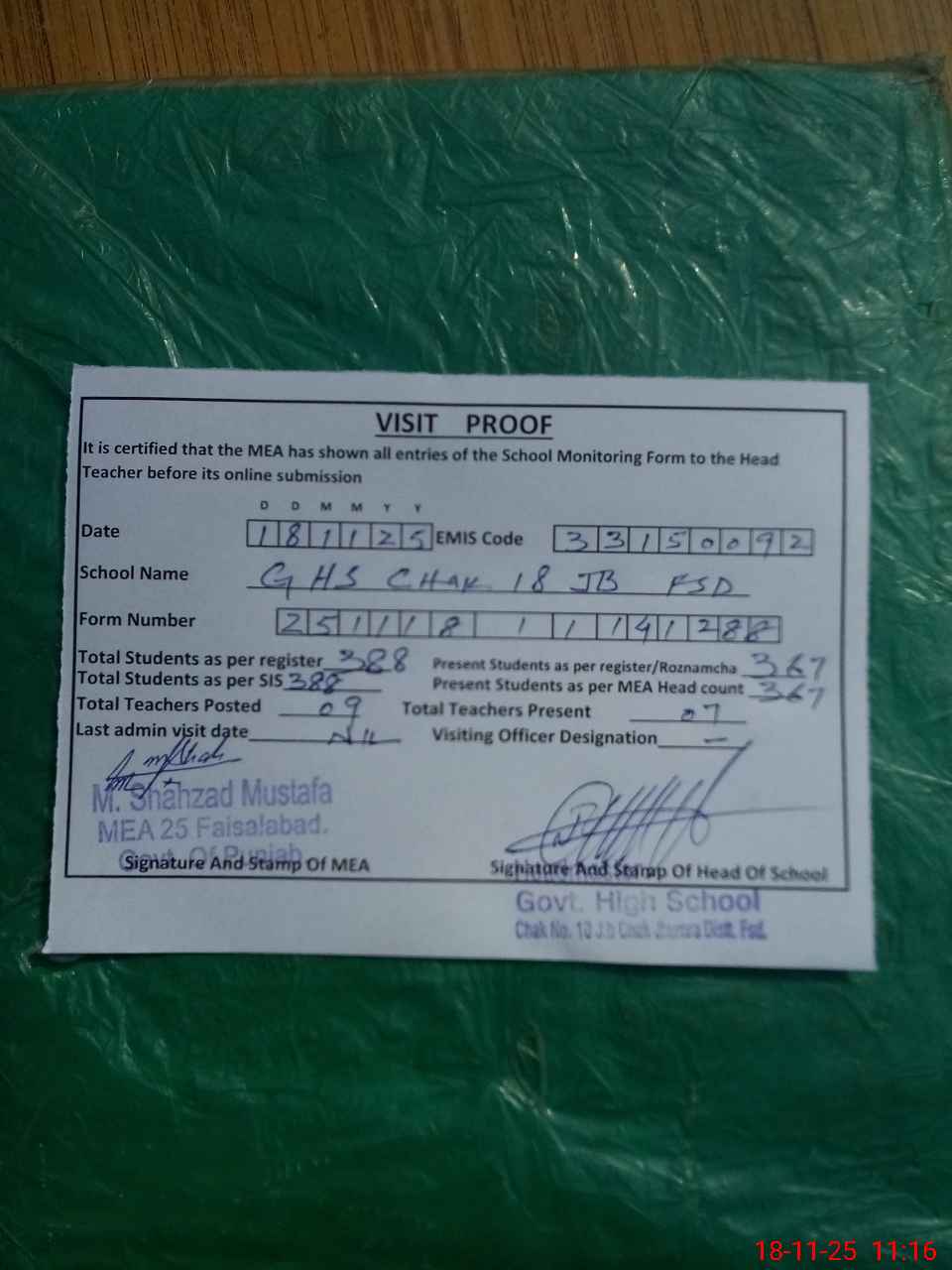 | Attendance Register | Head Teacher | MEA with School | Visit Proof |
