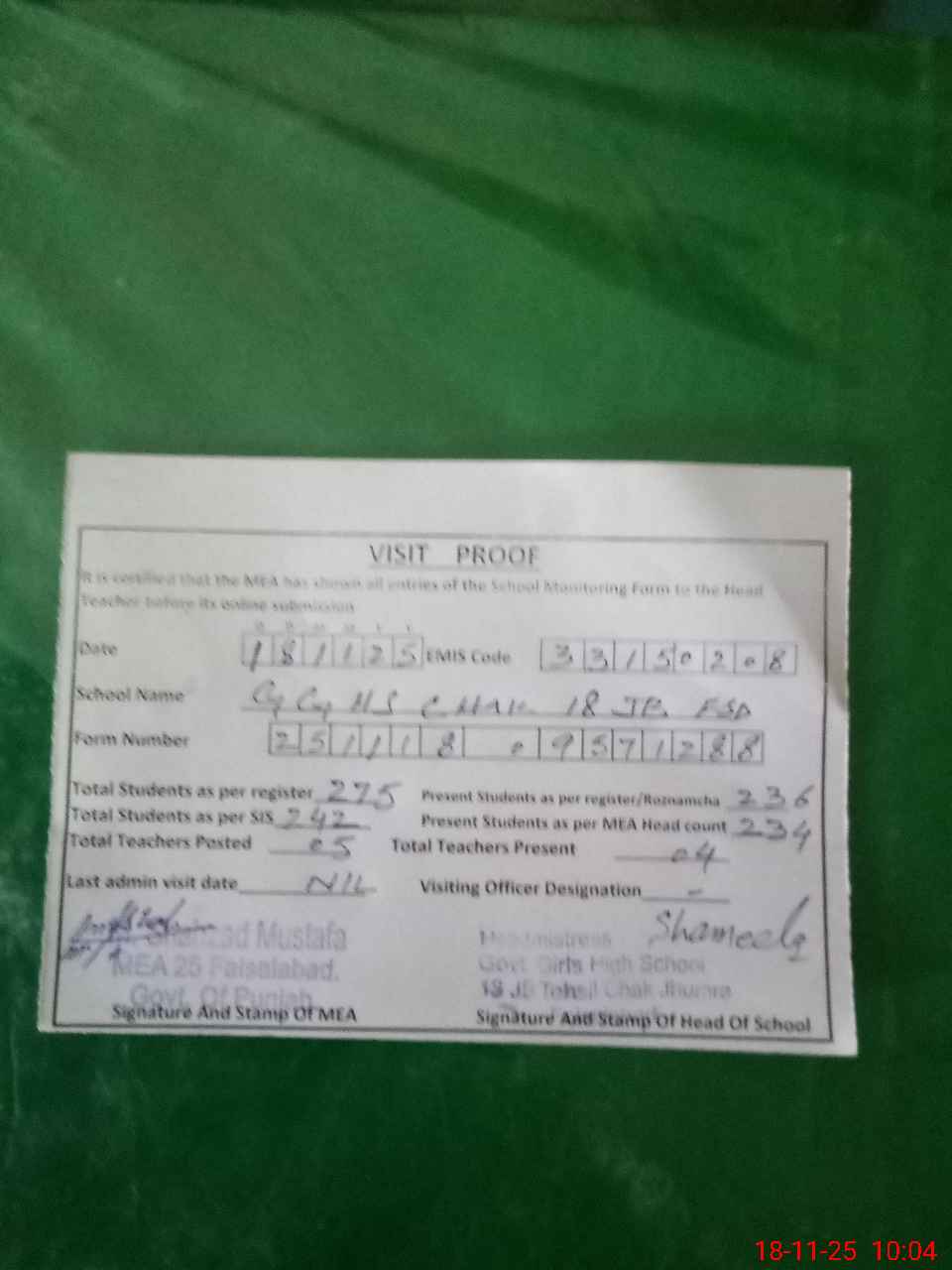 | EMIS Code: 33150208 | Name of School: GGHS CHAK NO. 18 JB | |||