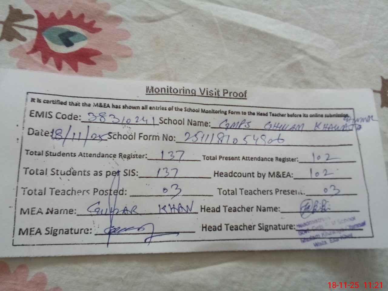 | Attendance Register | Head Teacher | MEA with School | Visit Proof |