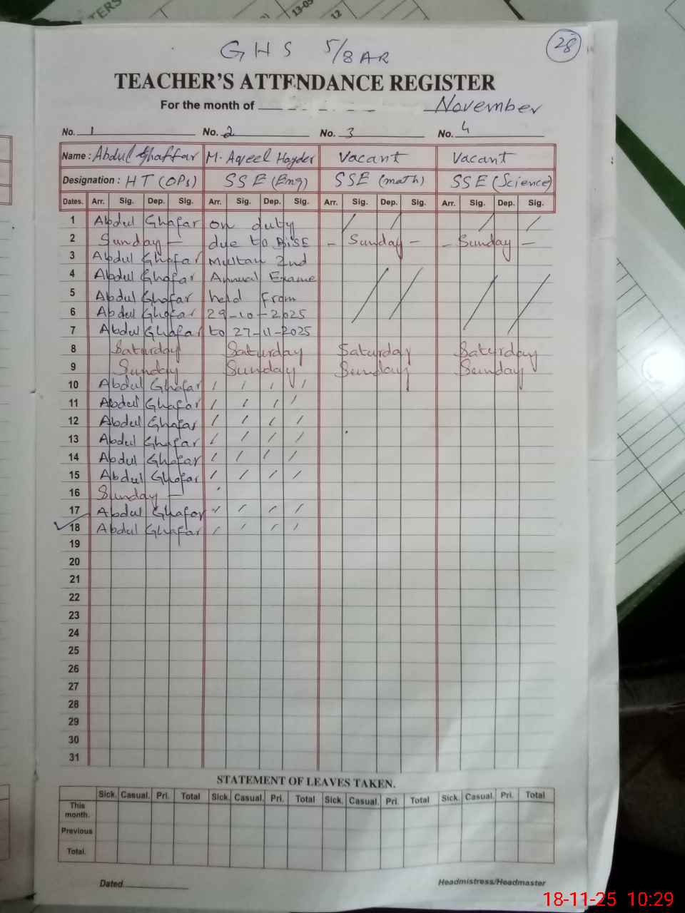 | 36**** | Mu**** Aq**** Ha**** | Contract | 1 | 4 | 0 | 0 | 0 | 0 | 0 | 0 | 1 | Exam Duty | |