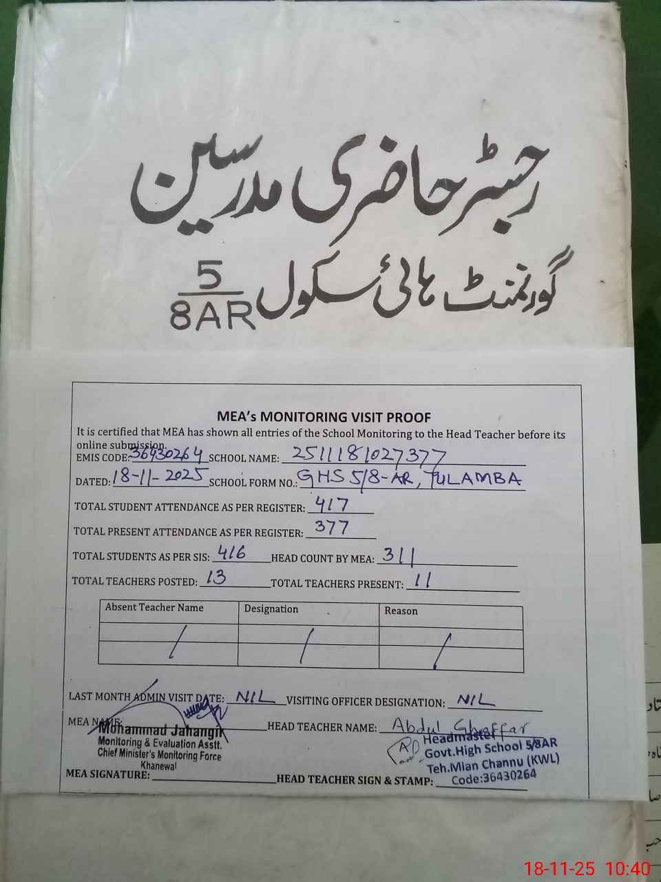 | Attendance Register | Head Teacher | MEA with School | Visit Proof |