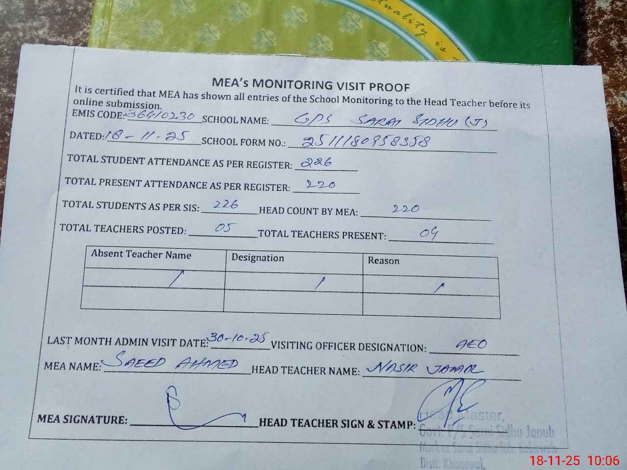 | EMIS Code: 36410230 | Name of School: GPS SARAI SIDHU JANUBI, SARAI SIDHU | |||