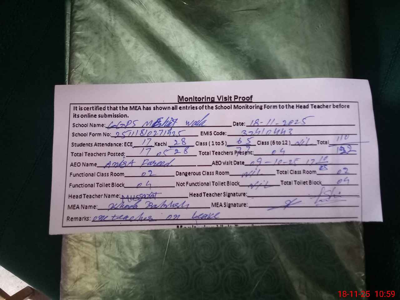 | Remarks (Use Separate Page if Required): One teacher on leave over all cleanliness good | |||||
