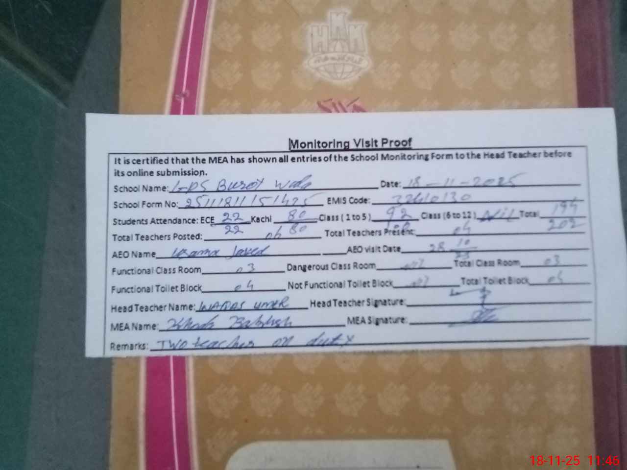 | Attendance Register | Head Teacher | MEA with School | Visit Proof |