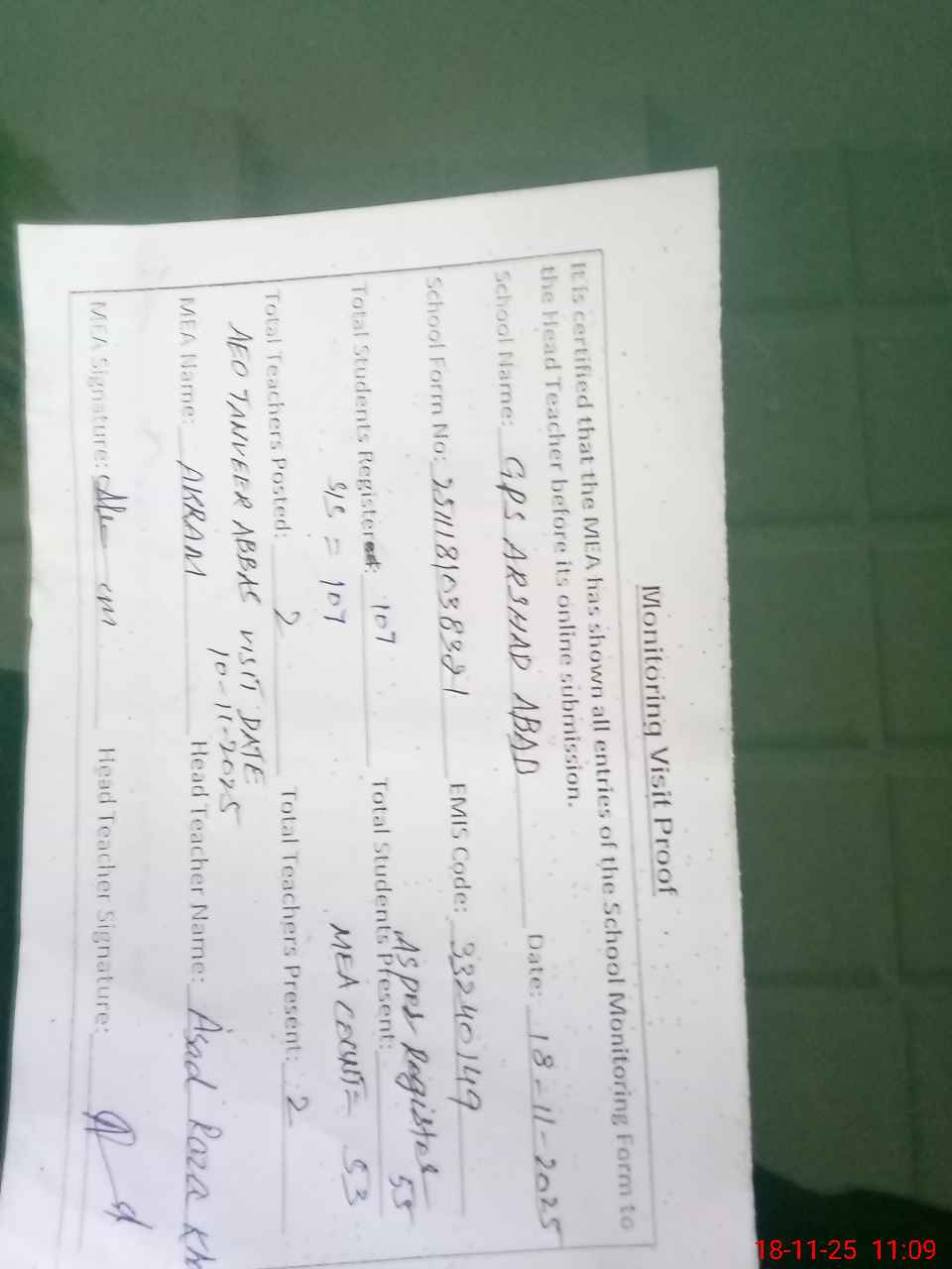 | Attendance Register | Head Teacher | MEA with School | Visit Proof |