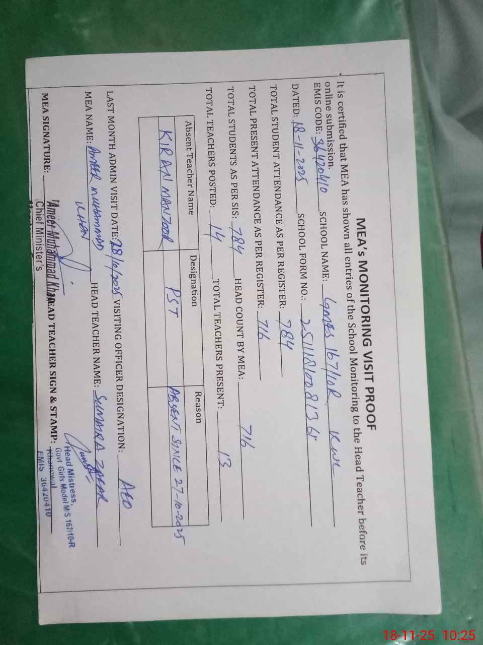 | Remarks (Use Separate Page if Required): PST Kiran Manzoor absent since 27 October 2025 | |||||