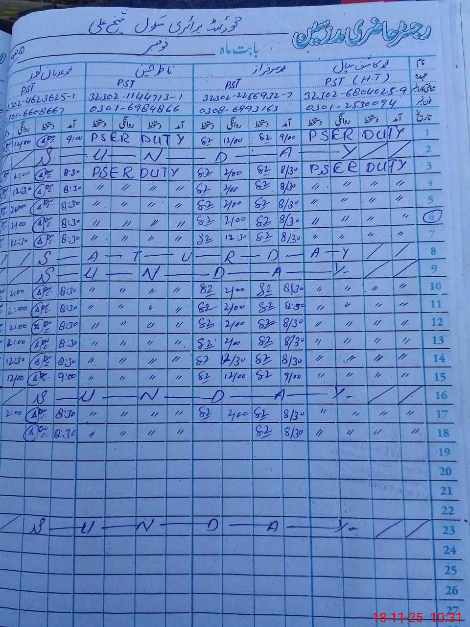 | CNIC | Full Name | Designation | R/C | Absence During Last Calender Month |
