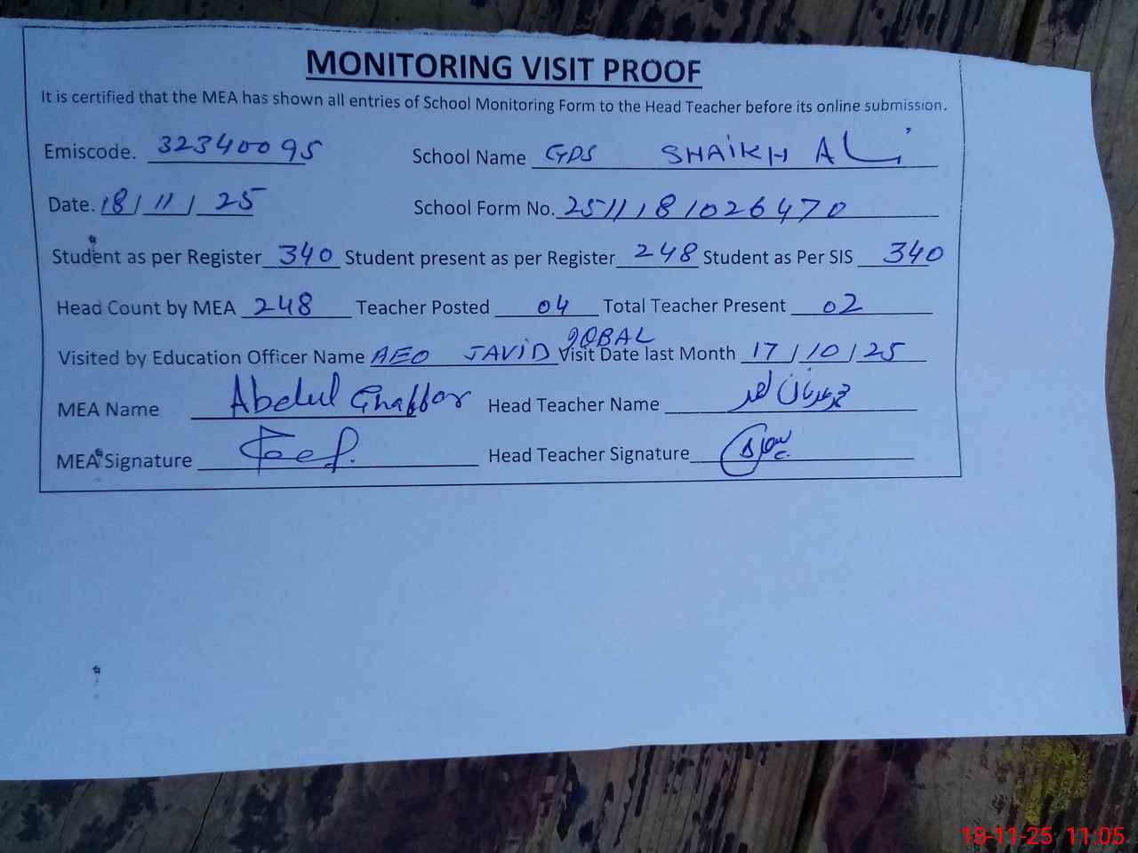 | Attendance Register | Head Teacher | MEA with School | Visit Proof |