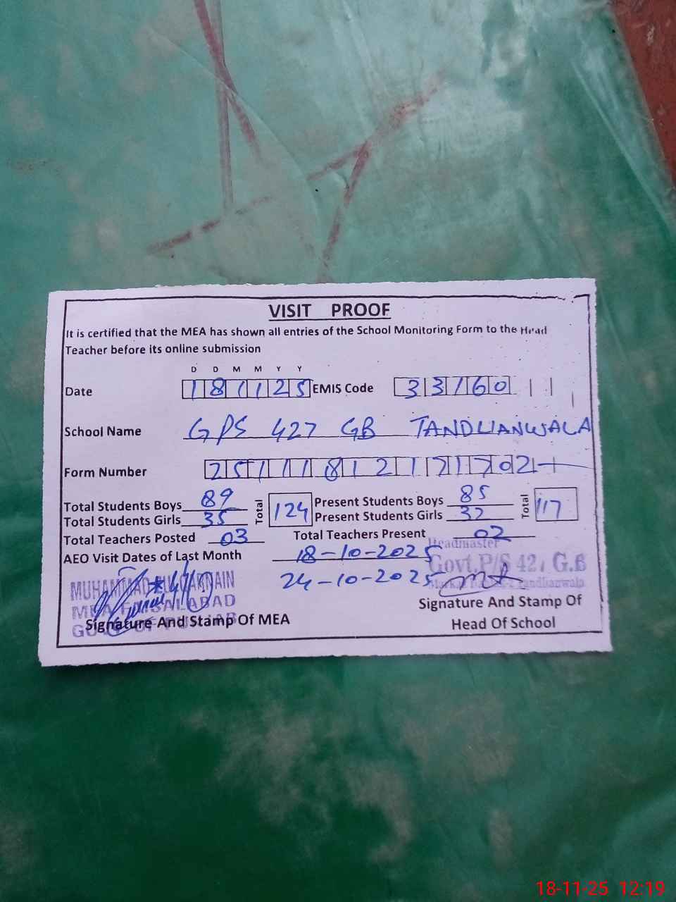 | Attendance Register | Head Teacher | MEA with School | Visit Proof |