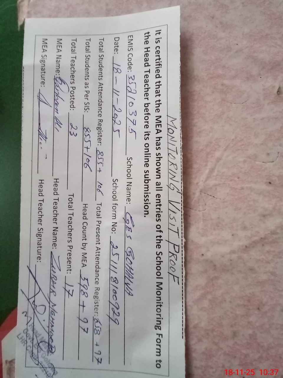 | Attendance Register | Head Teacher | MEA with School | Visit Proof |
