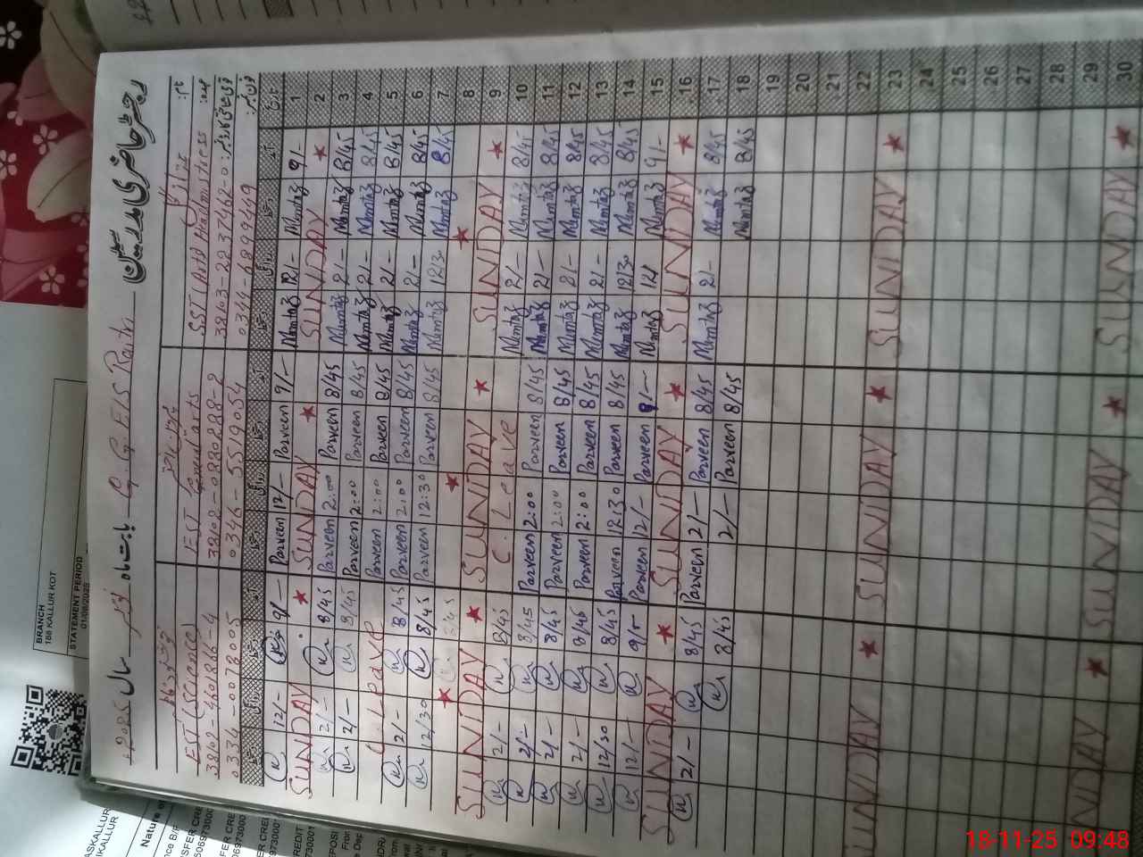 | CNIC | Full Name | Designation | R/C | Absence During Last Calender Month |