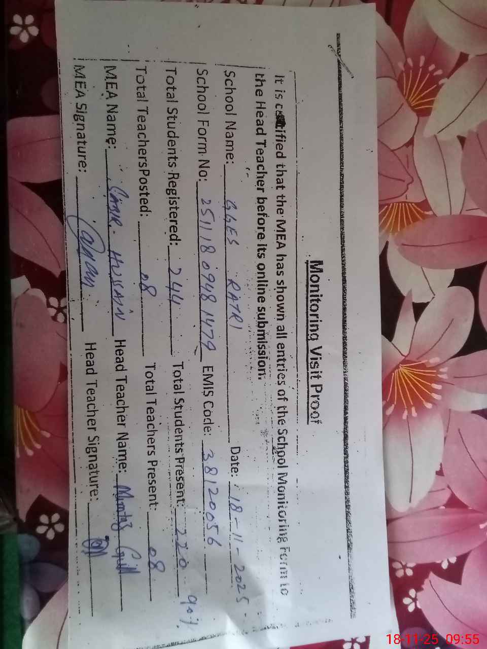 | Certified that this School was Inspected by the Undersigned MEA/DMO Today and the Information Stated Above is as Per Record. | |||||