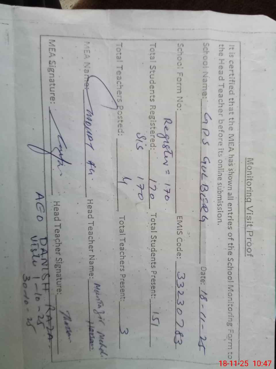 | EMIS Code: 33230783 | Name of School: GPS GULBERG ALLAH YAR JUTA | |||