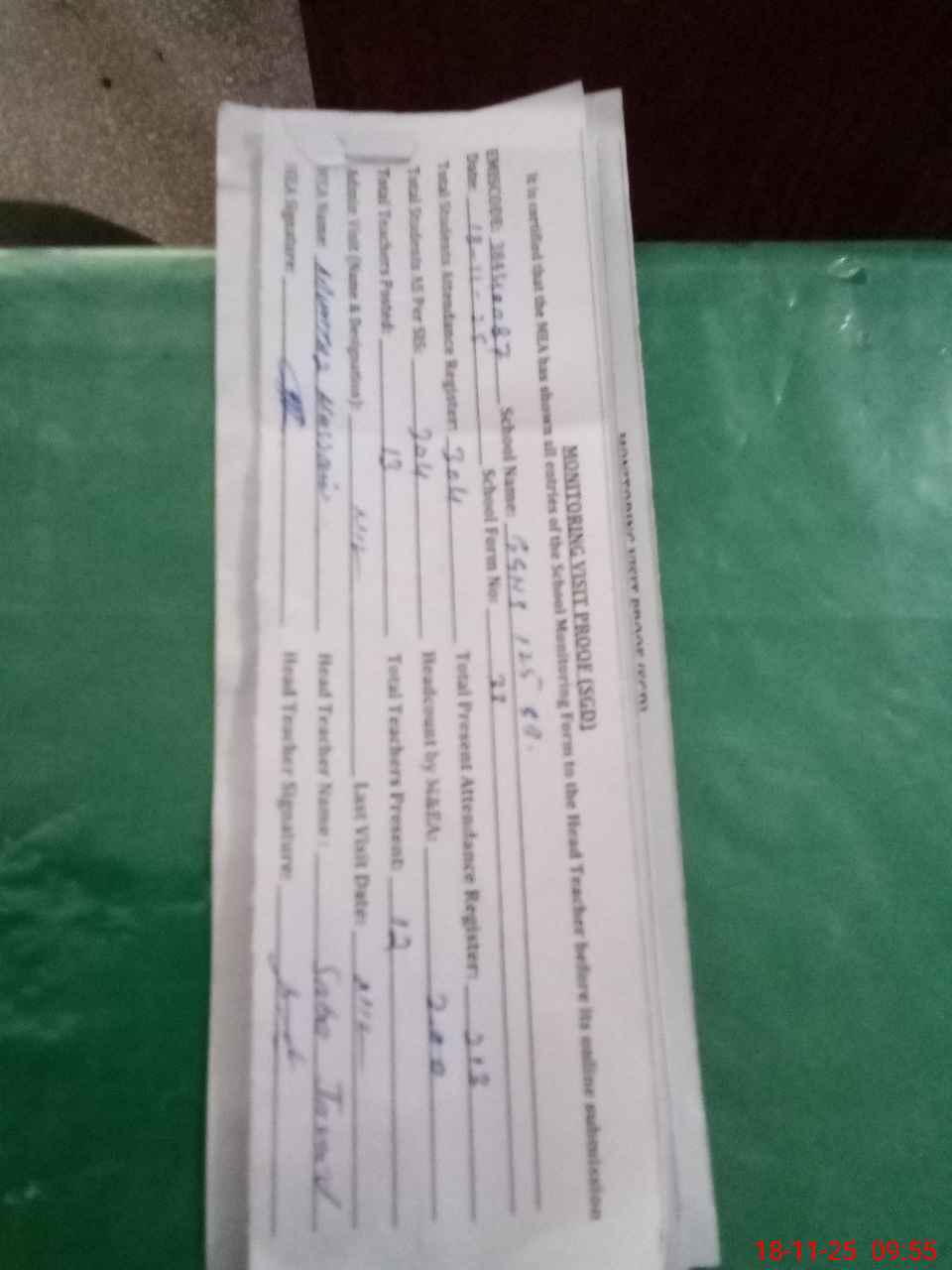 | Attendance Register | Head Teacher | MEA with School | Visit Proof |