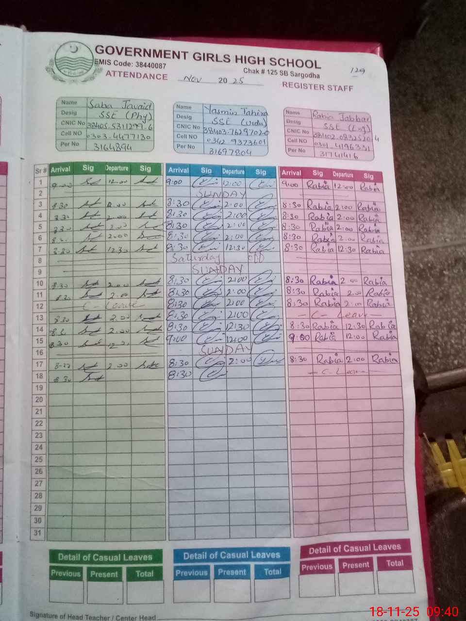 | CNIC | Full Name | Designation | R/C | Absence during last cal. month |