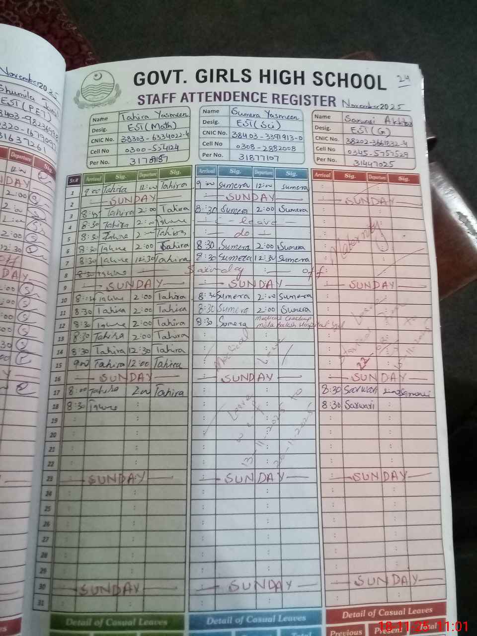 | CNIC | Full Name | Designation | R/C | Absence During Last Calender Month |