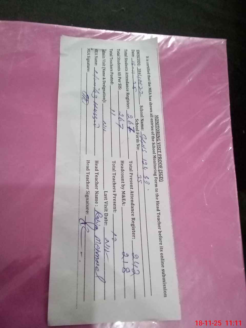 | Attendance Register | Head Teacher | MEA with School | Visit Proof |