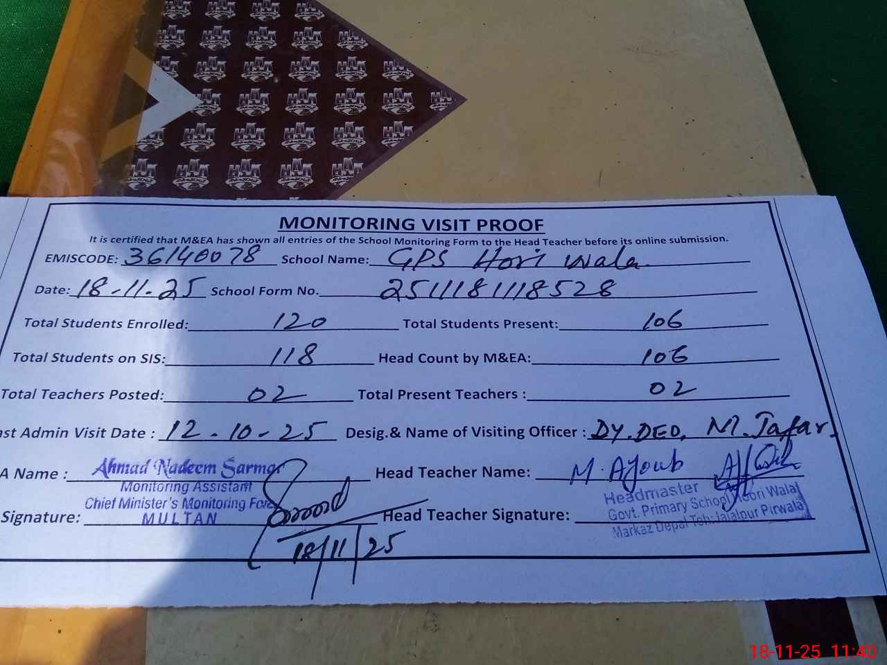 | Attendance Register | Head Teacher | MEA with School | Visit Proof |