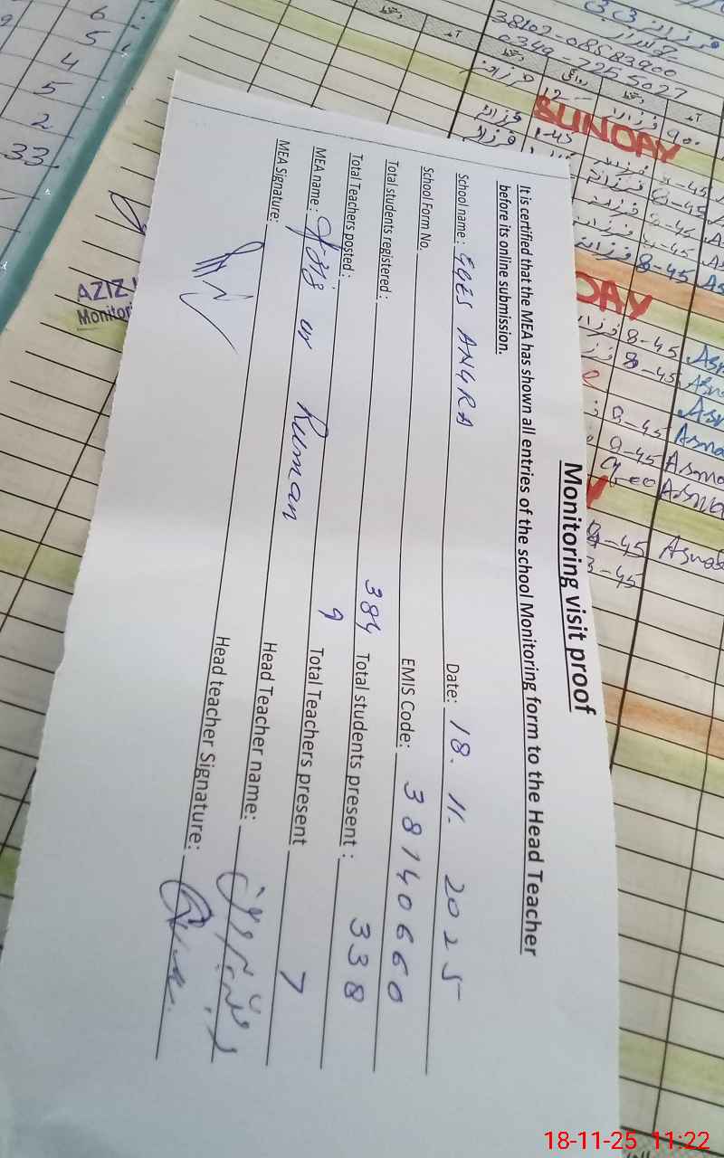 | Attendance Register | Head Teacher | MEA with School | Visit Proof |