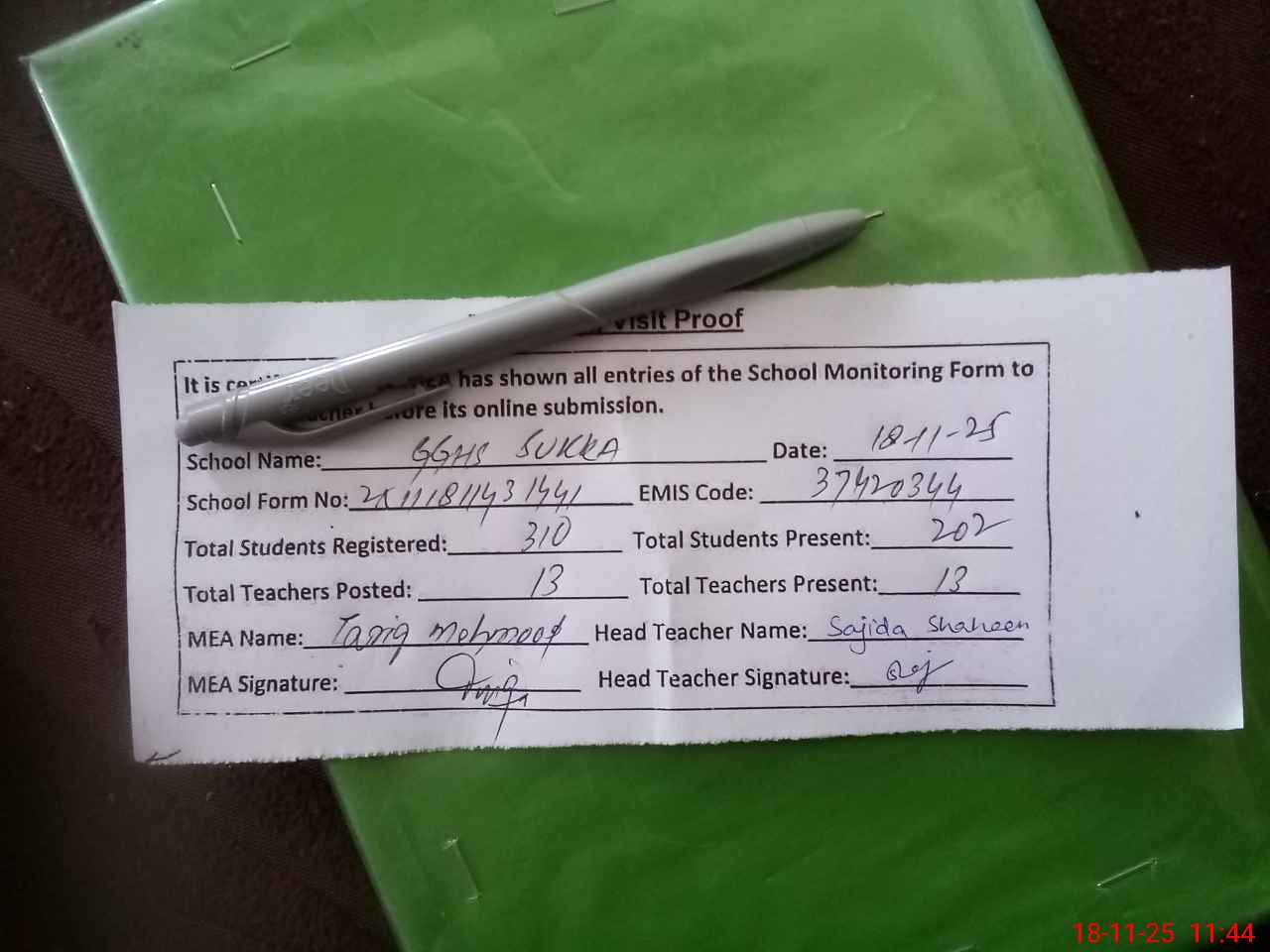 | Attendance Register | Head Teacher | MEA with School | Visit Proof |