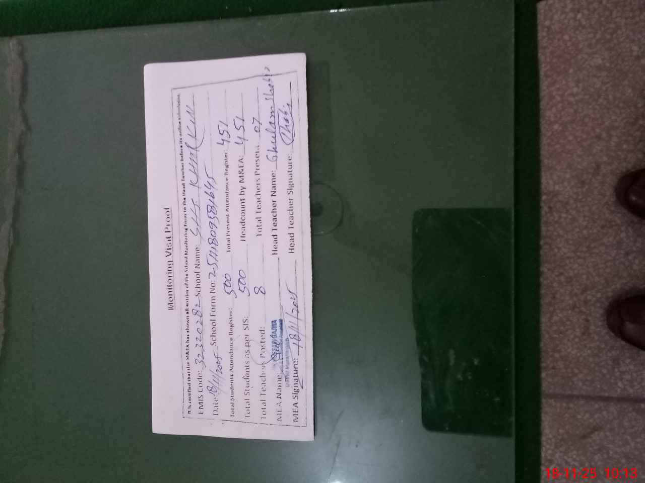 | Attendance Register | Head Teacher | MEA with School | Visit Proof |