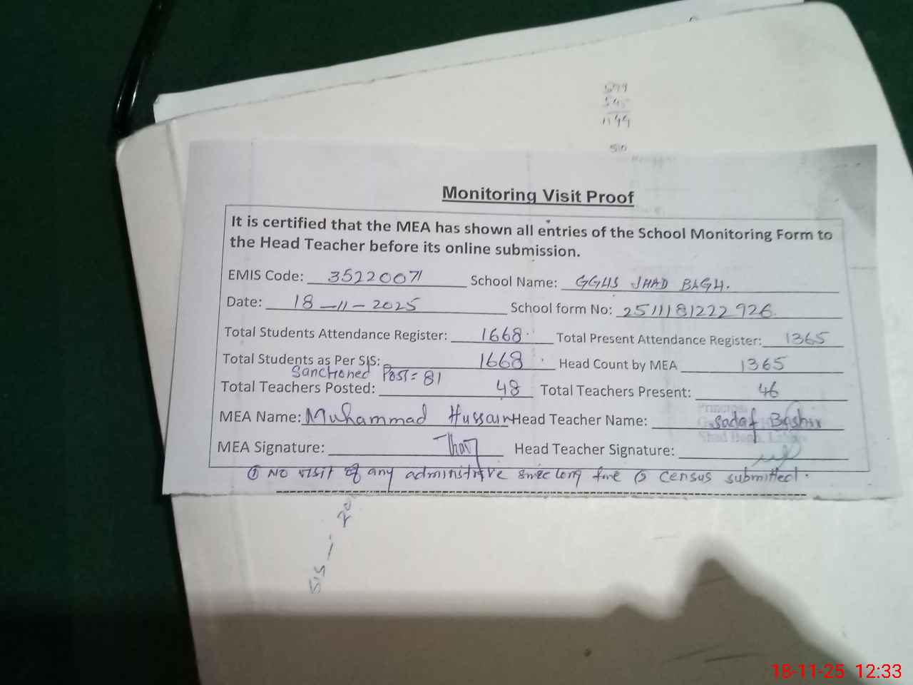 | Attendance Register | Head Teacher | MEA with School | Visit Proof |
