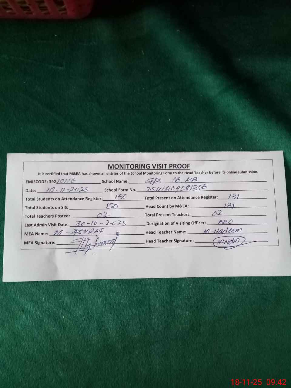 | EMIS Code: 39210116 | Name of School: GPS 16 KB | |||