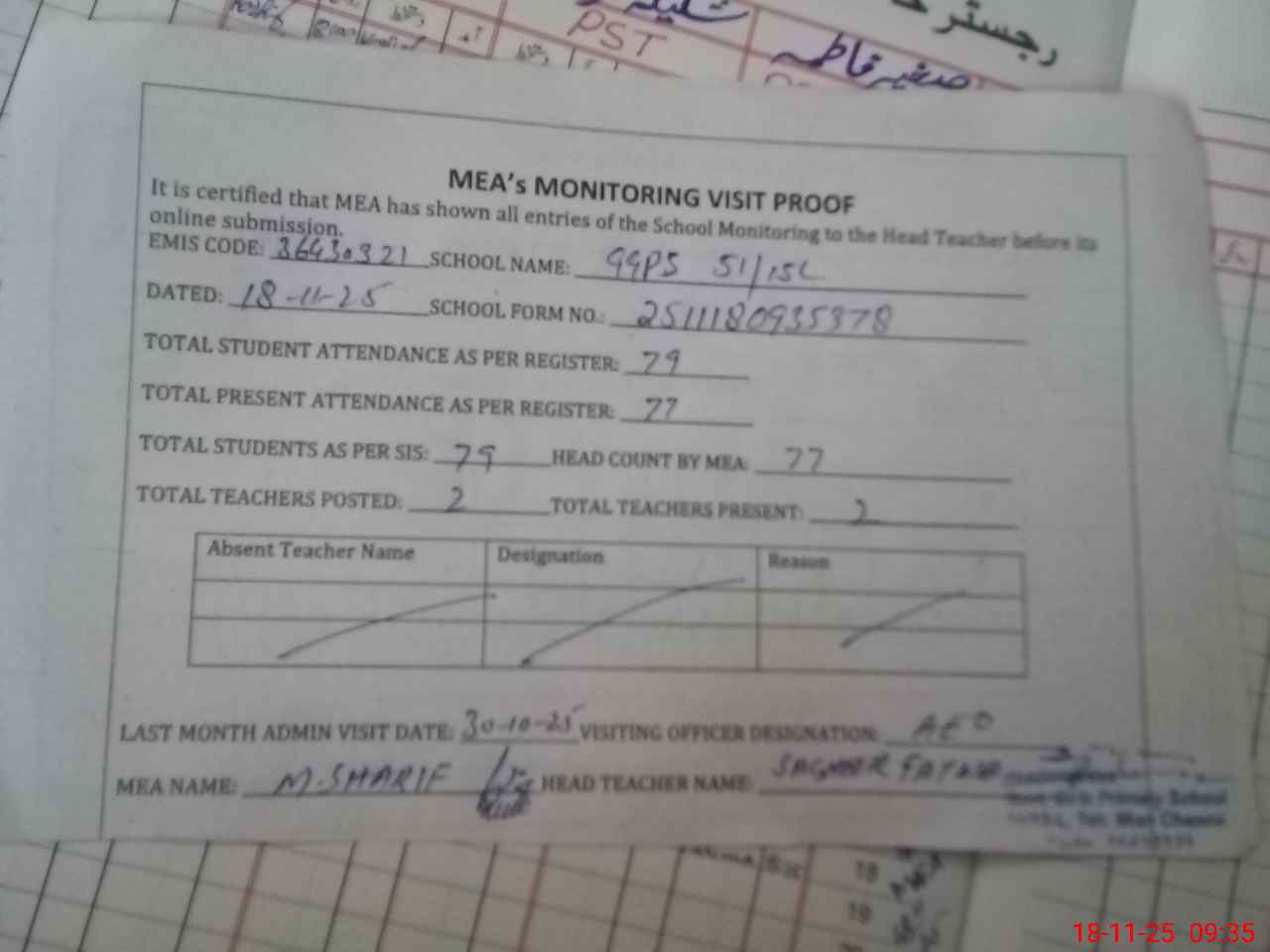 | Attendance Register | Head Teacher | MEA with School | Visit Proof |