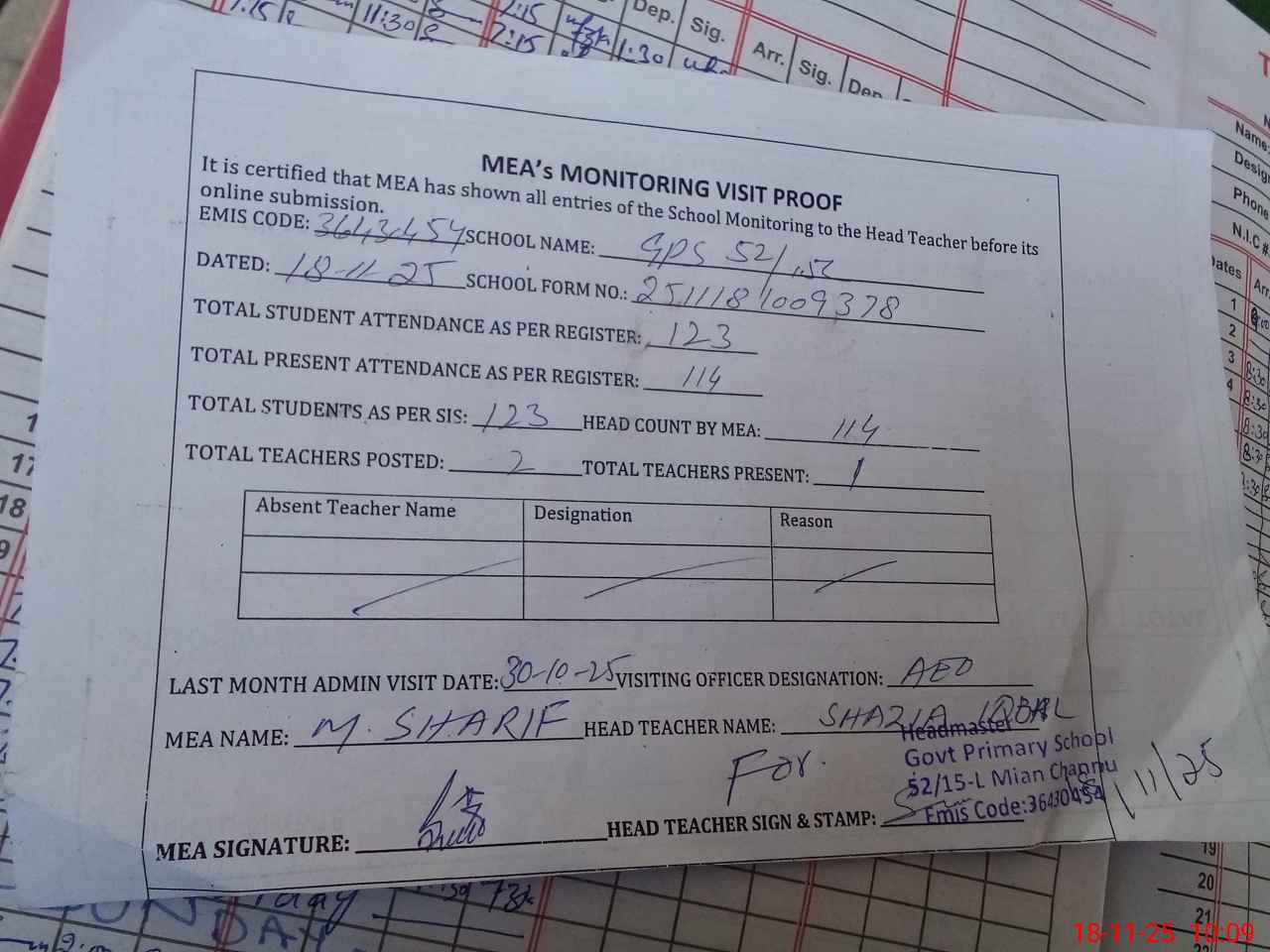 | Attendance Register | Head Teacher | MEA with School | Visit Proof |